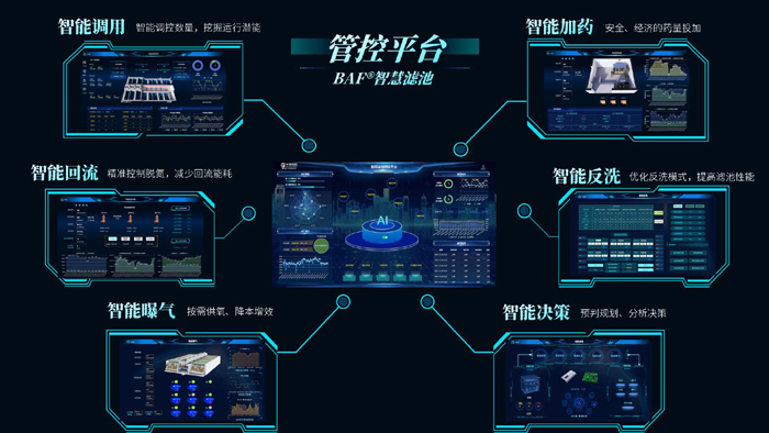 BAF智慧濾池?fù)碛兄悄苷{(diào)用、智能回流、智能反洗、智能加藥、智能曝氣、智能決策六大板塊,六駕“馬車”齊發(fā)力,充分發(fā)揮AI 人工智能在水廠運營中的有力作用。智能調(diào)用系統(tǒng)自動計算濾池運行數(shù)量,根據(jù)用戶需求交替啟用,確保冬季低溫下出水水質(zhì)穩(wěn)定達標(biāo),同時降低曝氣能耗;智能回流系統(tǒng)實時調(diào)控回流比,解決了硝化液回流過量的問題,確保濾池精準(zhǔn)脫氮,大幅節(jié)省電耗;針對不同功能的濾池,智能反洗系統(tǒng)通過選用循環(huán)洗、降水位反沖洗、強制反洗等模式,提高反洗效率,降低反洗頻次,節(jié)省電耗;智能加藥系統(tǒng)結(jié)合進水水質(zhì)水量,AI智能投加反硝化碳源,確??偟_標(biāo)的前提下大幅度降低藥耗;智能曝氣系統(tǒng)充分考慮氣泡經(jīng)濾料剪切帶來溶解氧升高的影響,實現(xiàn)按需供氧,降低曝氣能耗;智能決策系統(tǒng)根據(jù)運營需求,對不同控制模塊的經(jīng)濟性、安全性、穩(wěn)定性進行綜合比選,制定精準(zhǔn)、有效的控制方案。