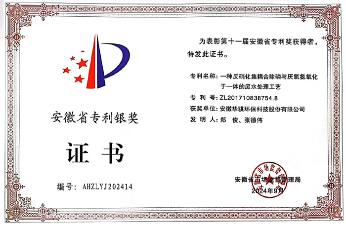 9月3日,安徽省市場監(jiān)督管理局(安徽省知識產權局)公示了第十一屆安徽省專利獎評選結果。華騏環(huán)?!耙环N反硝化集耦合除磷與厭氧氨氧化于一體的廢水處理工藝”發(fā)明專利榮獲安徽省專利銀獎。