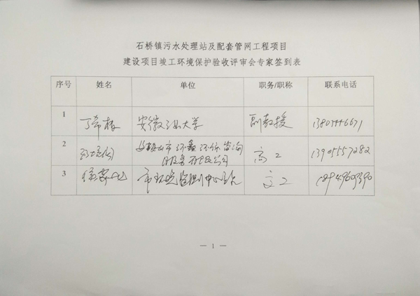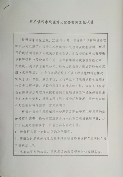 按照國(guó)家環(huán)保法規(guī),2018年4月1日當(dāng)涂縣華騏環(huán)境治理有限公司組織了對(duì)當(dāng)涂縣石橋鎮(zhèn)污水處理站及配套管網(wǎng)工程項(xiàng)目的建設(shè)項(xiàng)目竣工環(huán)境保護(hù)驗(yàn)收會(huì)議。參加會(huì)議的單位有安徽華騏環(huán)??萍脊煞萦邢薰?、當(dāng)涂縣華騏環(huán)境治理有限公司、安徽威正測(cè)試技術(shù)有限公司。驗(yàn)收會(huì)議由三人組成的驗(yàn)收專家組(名單附后),與會(huì)代表現(xiàn)場(chǎng)檢查了該工程設(shè)施的運(yùn)行情況,聽取了設(shè)計(jì)單位、施工單位、運(yùn)行單位和環(huán)境保護(hù)驗(yàn)收監(jiān)測(cè)單位關(guān)于工程設(shè)計(jì)、建設(shè)和驗(yàn)收監(jiān)測(cè)情況的匯報(bào),審查了《當(dāng)涂縣石橋鎮(zhèn)污水處理站及配套管網(wǎng)工程項(xiàng)目竣工環(huán)境保護(hù)驗(yàn)收?qǐng)?bào)告》等相關(guān)資料,根據(jù)工程實(shí)際完成和運(yùn)行情況,驗(yàn)收專家組針對(duì)驗(yàn)收材料給出以下意見及建議: