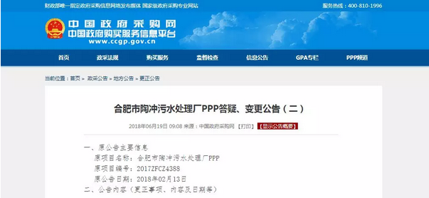 近日,備受關(guān)注的合肥市十五里河污水處理廠、合肥市陶沖污水處理廠兩大PPP項(xiàng)目同時(shí)發(fā)布答疑、變更公告,將開標(biāo)時(shí)間(投標(biāo)截止時(shí)間)變更為2018年7月10日9:30。距離原定開標(biāo)時(shí)間過(guò)去2個(gè)月,這兩大污水廠即將再次展開爭(zhēng)奪戰(zhàn)。