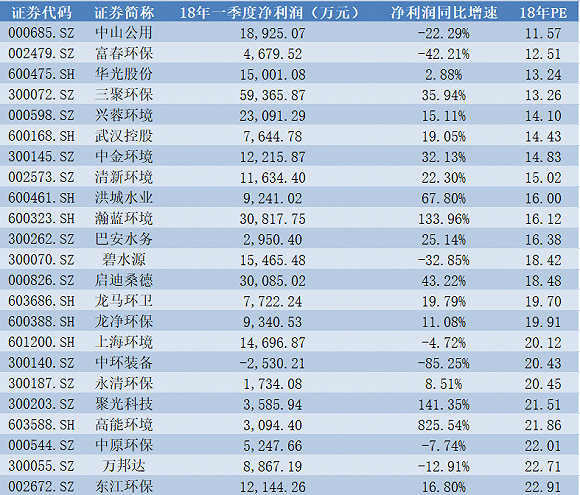 界面新聞梳理了全部環(huán)保板塊上市公司一季報業(yè)績以及當(dāng)前情況下的市盈率水平,具體情況如下表所示(下表中“預(yù)測PE”為根據(jù)多家券商一致性預(yù)測出的2018年凈利潤及5月7日收盤價所計算出的市盈率):