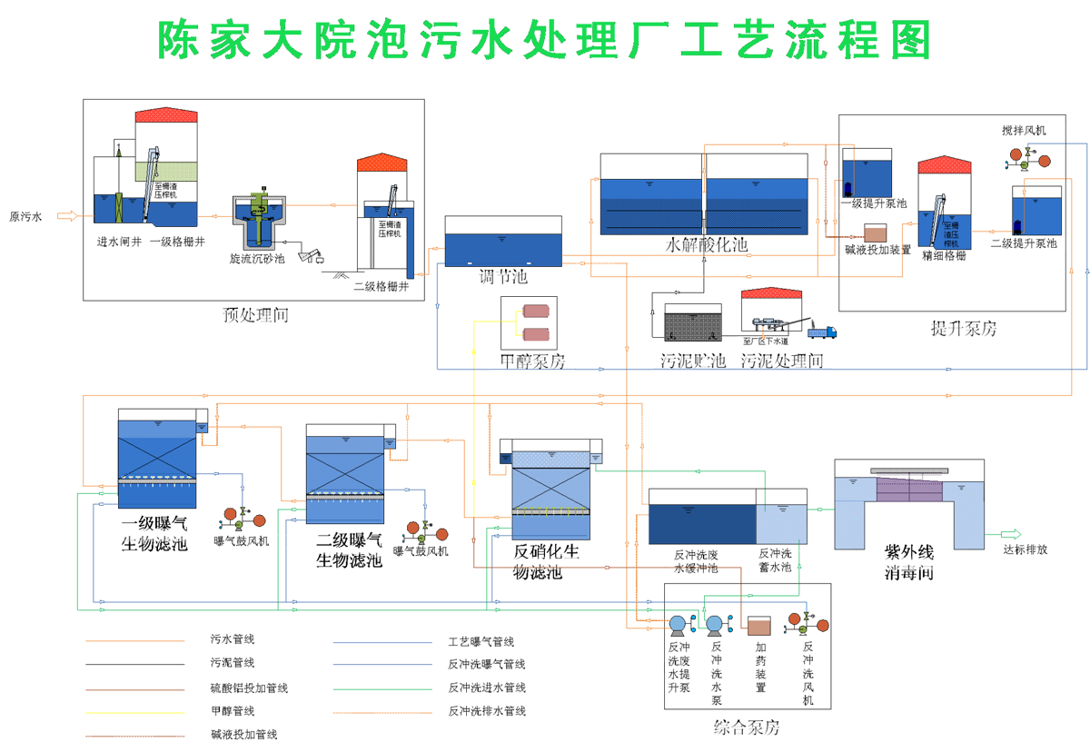 該污水處理廠主體工藝由預處理間、調(diào)節(jié)池、提升泵房、水解酸化池、一級曝氣生物濾池、二級曝氣生物濾池和反硝化生物濾池、紫外線消毒間等構筑物組成。其中曝氣生物濾池采用我公司專利技術“后置反硝化脫氮工藝”。出水水質可達到國家《城鎮(zhèn)污水處理廠污染物排放標準》(GB18918-2002)中的一級A類標準。