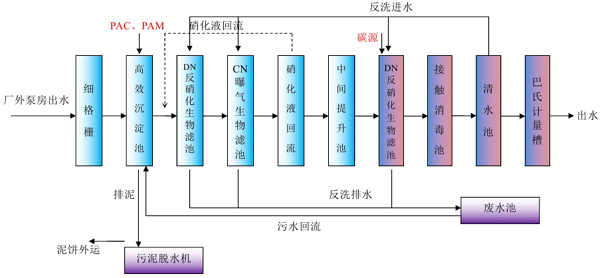 馬鞍山城鎮(zhèn)南部污水處理廠規(guī)劃設(shè)計(jì)總規(guī)模9.5萬噸/天,現(xiàn)狀規(guī)模只能處理4.5萬噸/天。根據(jù)現(xiàn)狀進(jìn)水水量監(jiān)測,其水量已超過目前污水處理廠處理量的20%,須對馬鞍山城鎮(zhèn)南部污水處理廠擴(kuò)建,擴(kuò)建處理規(guī)模5萬噸/天污水處理廠一座。本工程采用先進(jìn)的“高效沉淀池+中置硝化三級生物濾池”的組合工藝,再經(jīng)過末端處理出水達(dá)到“準(zhǔn)Ⅳ類標(biāo)準(zhǔn)”后排放至朝陽溝。本工程脫水后污泥(80%)運(yùn)至指定地點(diǎn)進(jìn)行處置。