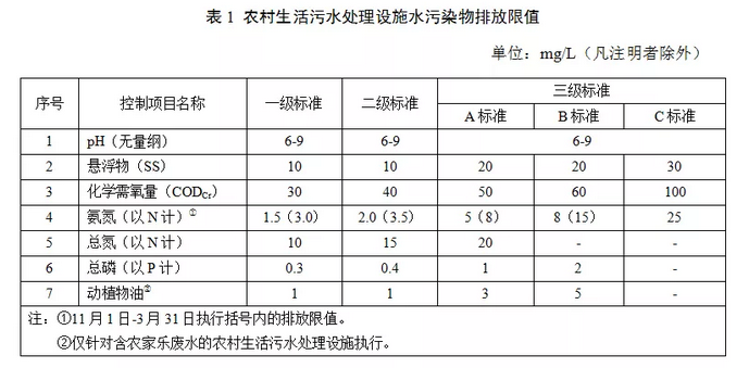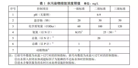 2.自本標準實施之日起,新(改、擴)建處理能力在500m3/d以下的農(nóng)村生活污水處理設施排水污染物最高允許排放濃度限值按表1規(guī)定執(zhí)行。