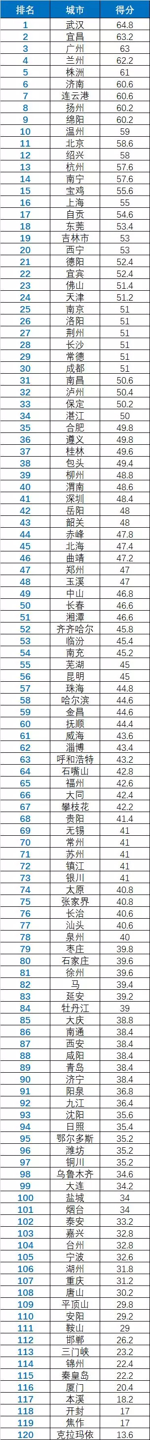 2019年,環(huán)保公益組織公眾環(huán)境研究中心通過搜集政府公開信息,對全國120個環(huán)保重點城市的水質信息公開進行評價,該表為水質信息公開指數(shù)排名,排名越靠前公開質量越高。