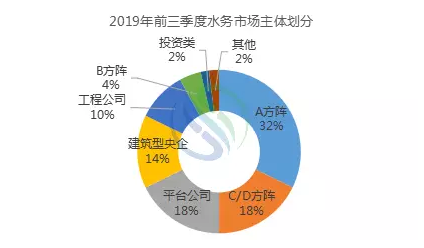 從水務(wù)市場主體份額的占比看,水務(wù)市場主體正在發(fā)生悄然變化,A方陣、C/D方陣、平臺公司、建筑型央企、工程公司所拿項(xiàng)目數(shù)量占比整個水務(wù)市場總數(shù)量的92%,并形成了五雄割據(jù)的局面。值得一提的是,今年以來,平臺公司和建筑型央企在水務(wù)市場的表現(xiàn)搶眼,會對水務(wù)市場原有的格局造成一定的沖擊。