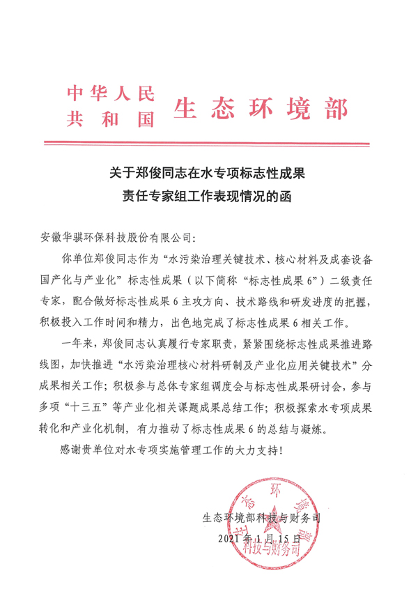 近日,國(guó)家生態(tài)環(huán)境部給安徽華騏環(huán)??萍脊煞萦邢薰景l(fā)來(lái)了感謝信,對(duì)華騏環(huán)保副董事長(zhǎng)兼總工程師鄭俊先生作為“水污染治理關(guān)鍵技術(shù)、核心材料及成套設(shè)備國(guó)產(chǎn)化與產(chǎn)業(yè)化”標(biāo)志性成果二級(jí)責(zé)任專(zhuān)家期間的出色工作表示肯定與感謝。