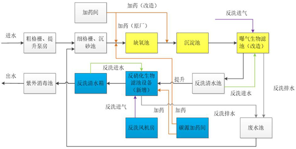 仁壽縣城市生活污水處理廠改造提升工程日平均處理污水量為2.0萬立方米。廠區(qū)主體工藝采用“缺氧池、沉淀池+BAF曝氣生物濾池”處理工藝,經(jīng)處理后的污水水質(zhì)排放標準為《城鎮(zhèn)污水處理廠污染物排放標準》(GB18918-2002)一級A排放標準。改造后采用“缺氧池、沉淀池+BAF曝氣生物濾池+反硝化魔方尊”處理工藝。改造后出水指標需滿足《四川省岷江、沱江流域水污染排放標準》。