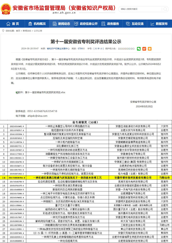 近日,安徽省市場監(jiān)督管理局(安徽省知識產(chǎn)權(quán)局)公示了第十一屆安徽省專利獎評選結(jié)果。安徽華騏環(huán)??萍脊煞萦邢薰尽耙环N反硝化集耦合除磷與厭氧氨氧化于一體的廢水處理工藝”發(fā)明專利榮獲安徽省專利銀獎。
